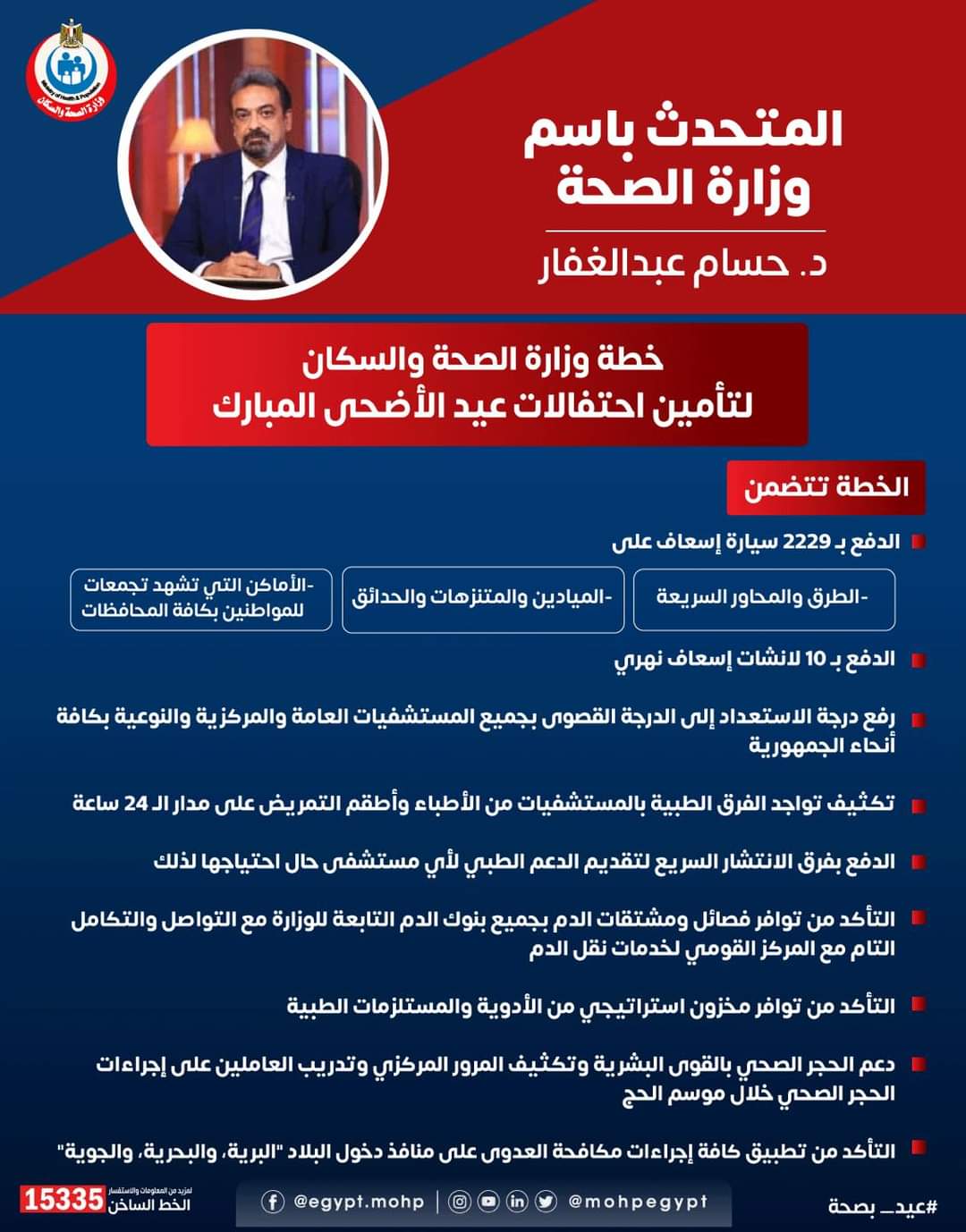تستعد وزارة الصحة والسكان بمجموعة من الإجراءات للتأمين الطبي لاحتفالات عيد الأضحى المبارك والتي نستعرضها في النقاط التالية..