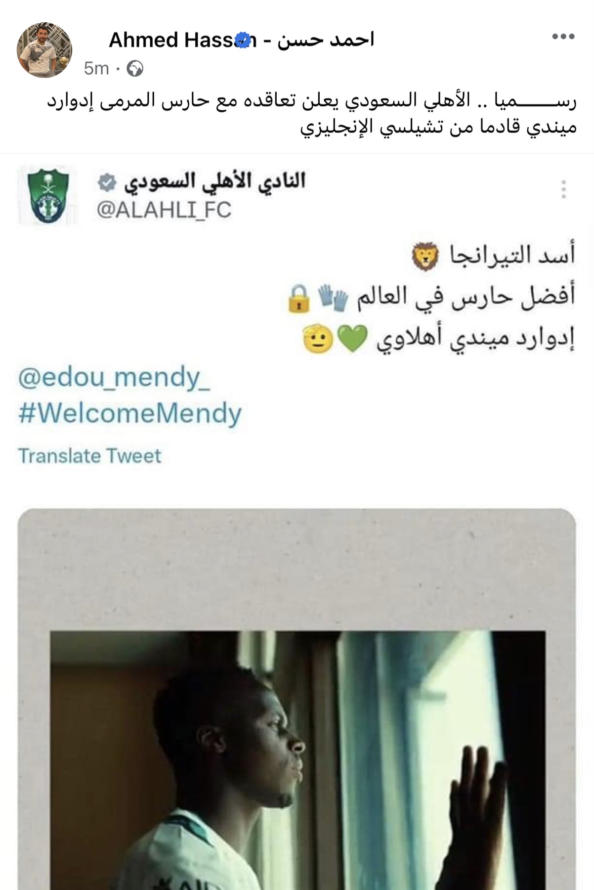 وكتب أحمد حسن عبر حسابه: “رسميا .. الأهلي السعودي يعلن تعاقده مع حارس المرمى إدوارد ميندي قادما من تشيلسي الإنجليزي”.