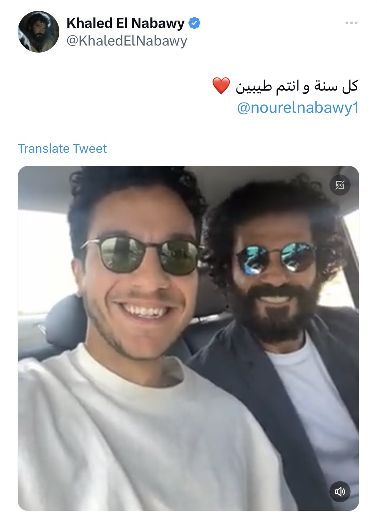 وظهر خالد النبوي في فيديو برفقه نجله نور النبوي، وتحدث في الفيديو قائلًا: “كل سنة وانتم طيبين وعيد سعيد عليكم وعلي الأمة العربية والإسلامية كلها”.