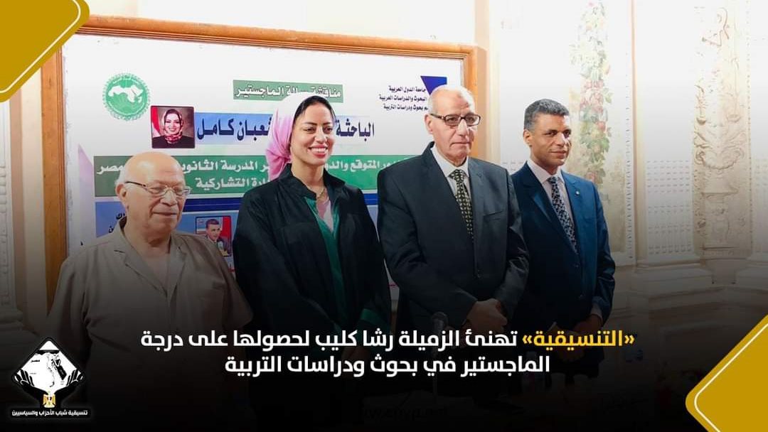 تهنئ تنسيقية شباب الأحزاب والسياسيين، الزميلة النائبة رشا كليب، عضو مجلس النواب عن التنسيقية، بمناسبة حصولها على درجة الماجستير بتقدير امتياز في بحوث ودراسات التربية من معهد البحوث والدراسات العربية.