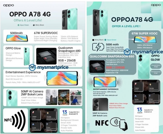 وسيتوفر هاتف Oppo A78 4G في لونين هما: الأسود والأخضر، وسيتم تفصيل الأسعار والتوافر عند إطلاق الجهاز رسميا.