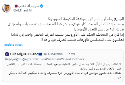 أثارت تغريدة نشرها الناطق باسم الاتحاد الأوروبي لمنطقة الشرق الأوسط وشمال إفريقيا حول حرق نسخة من القرآن في السويد أول أيام عيد الأضحى، استفزاز الشيخة القطرية، مريم آل ثاني حيث اعتبر أن هذا التصرف فردي لا يمثل ملايين المواطنين ولا قيمهم.