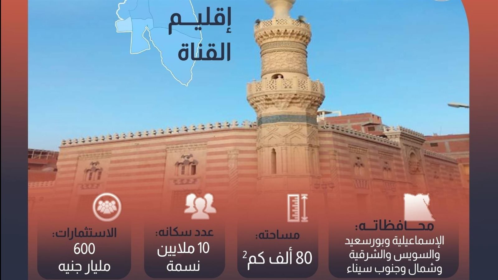 وأوضح الإنفوجراف أن إقليم القناة يحمل أهمية تاريخية واقتصادية كبرى لمصر، إذ يمر منه 12% من حجم التجارة العالمية، لذلك أطلقت الدولة مجموعة من المشروعات لتحديث البنية التحتية بالإقليم، بدءًا من شق قناة السويس الجديدة، ومرورًا بشق أنفاق القناة لربط سيناء بالوادي، وانتهاء بإطلاق أكبر مشروع للاستصلاح الزراعي بشبه جزيرة سيناء.