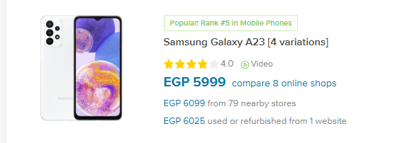 ويتوفر هاتف سامسونج Galaxy A23 في السوق المصري بسعر حوالي 5 آلاف و 999 جنيه، علما بأن السعر يختلف حسب النسخة وأيضا حسب المتجر.