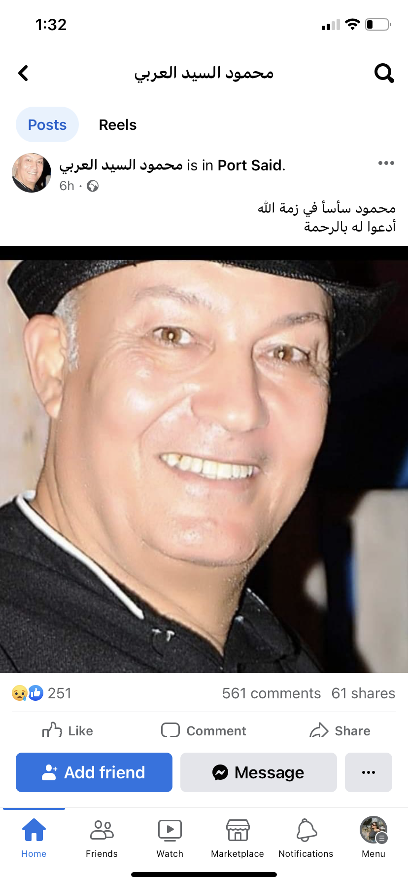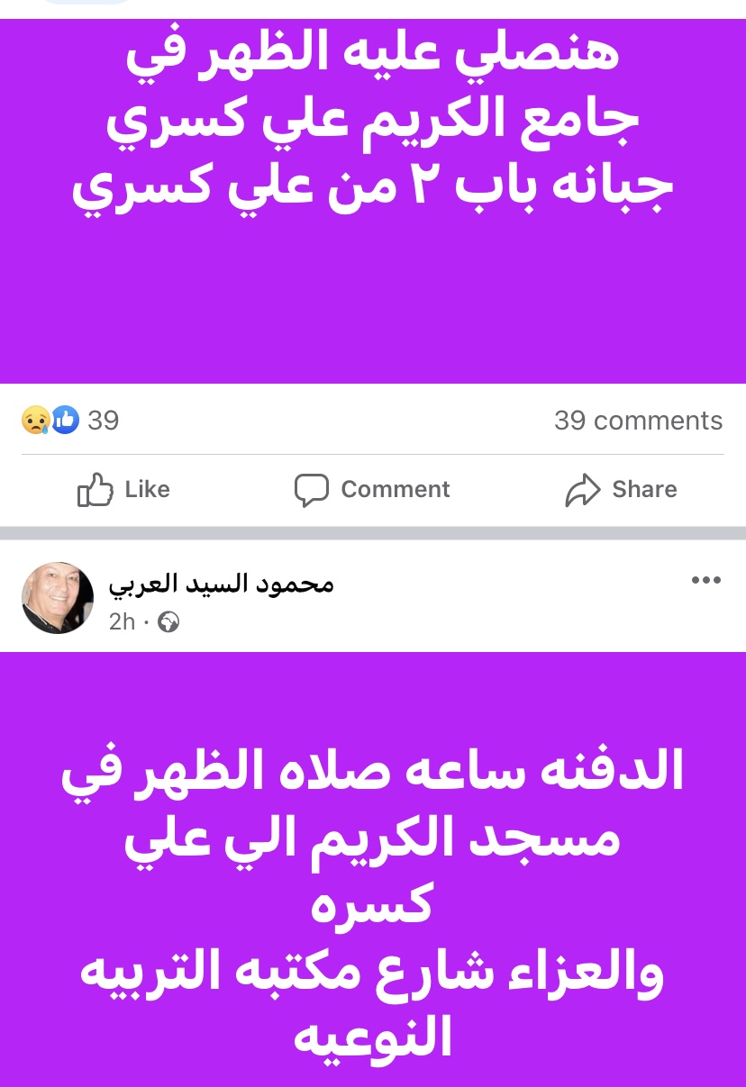وكشف الحساب أيضا عن موعد ومكان صلاة الجنازة عليه ببورسعيد، حيث كتب: "الدفنة ساعة صلاة الظهر فى مسجد الكريم، والعزاء شارع مكتبة التربية النوعية، ادعوا له بالرحمة".