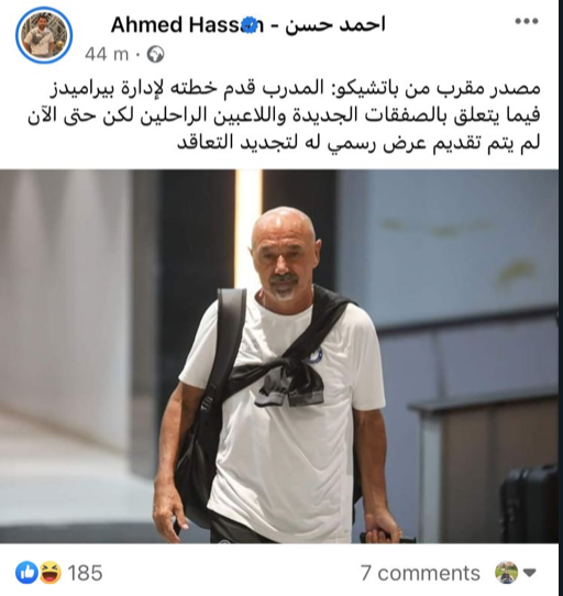 أعلن أحمد حسن، لاعب منتخب مصر السابق عن مصير باتشيكو، مدرب بيراميدز عبر حسابه بموقع فيسبوك.
