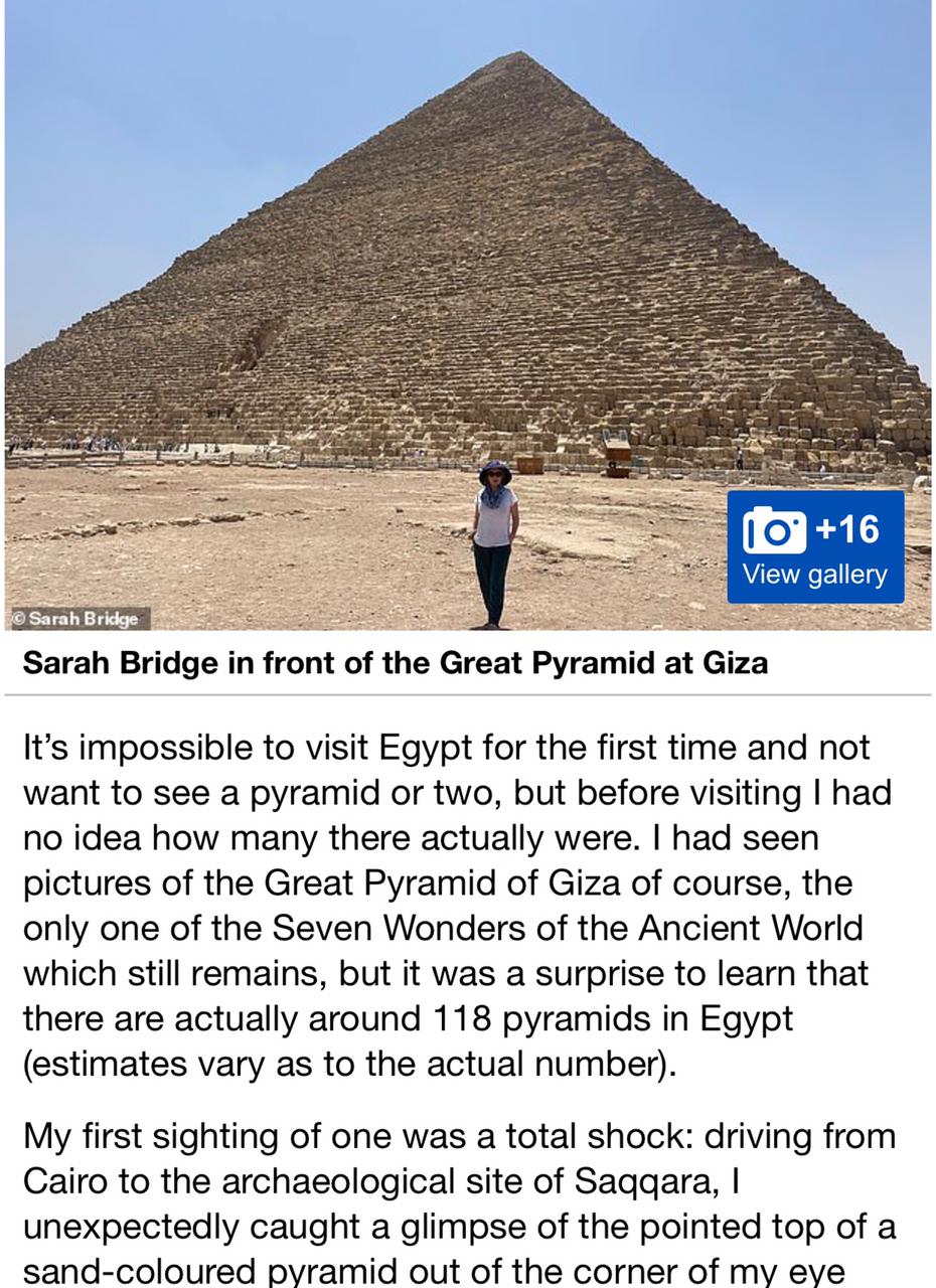 وأوضحت الكاتبة أن الأهرامات تعد من أول الأسباب لأن يكون المقصد المصرى الخيار للراغبين في قضاء الإجازة وأنه من المستحيل زيارة مصر دون رؤية هرمًا أو اثنين مشيرة إلى أن الهرم الأكبر في الجيزة هو الوحيد من عجائب الدنيا السبع في العالم القديم الذي لا يزال باقياً، لافتة إلى مناطق آثار أبو صبر وسقارة والمجموعات الأثرية الضخمة بها من مقابر وأهرامات ومعابد.