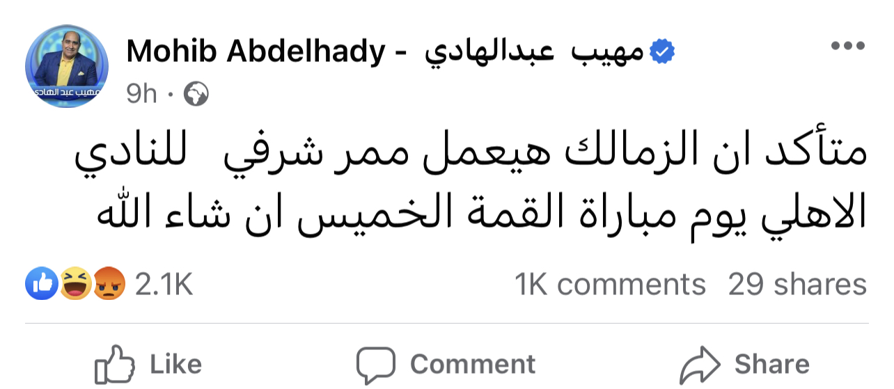 وكتب مهيب عبد الهادي: “متأكد ان الزمالك هيعمل ممر شرفي للنادي الاهلي يوم مباراة القمة الخميس ان شاء الله”.