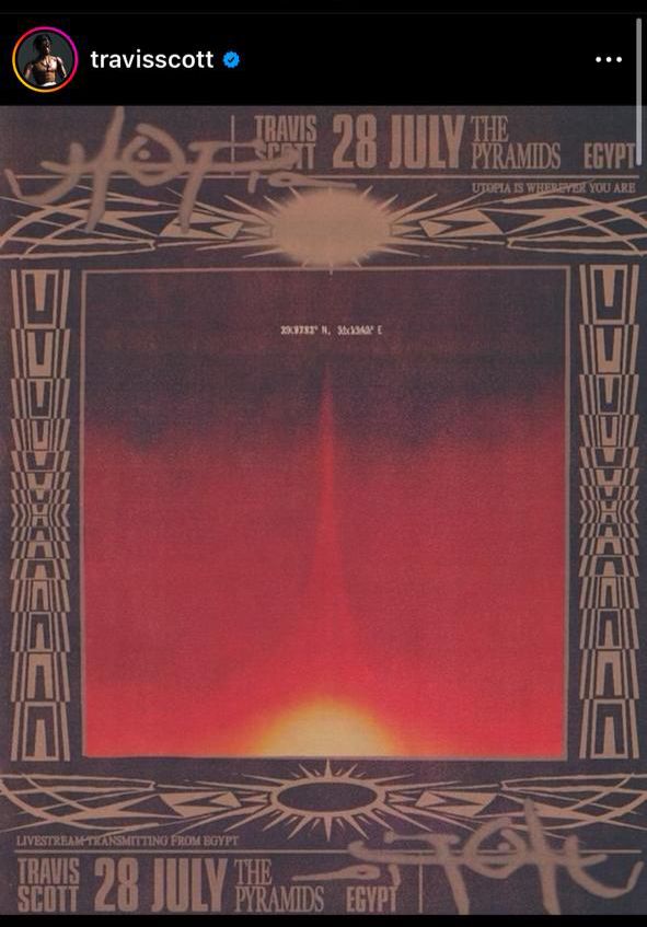 نشر مغني الراب الأمريكي ترافيس سكوت البوستر الرسمى لحفله الغنائى الذى من المقرر أن يقام فى مصر أمام الأهرامات وذلك عبر قناته على موقع التواصل الاجتماعى إنستجرام.