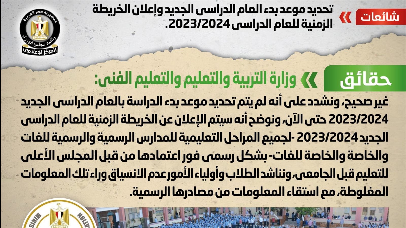 وقد قام المركز الإعلامي لمجلس الوزراء بالتواصل مع وزارة التربية والتعليم والتعليم الفني، والتي نفت تلك الأنباء، مُؤكدةً أنه لا صحة لتحديد موعد بدء العام الدراسي الجديد وإعلان الخريطة الزمنية للعام الدراسي 2023/2024، مُشددةً على أنه لم يتم تحديد موعد بدء الدراسة بالعام الدراسي الجديد 2023/2024 حتى الآن، مُوضحةً أنه سيتم الإعلان عن الخريطة الزمنية للعام الدراسي الجديد 2023/2024 -لجميع المراحل التعليمية للمدارس الرسمية والرسمية للغات والخاصة والخاصة للغات- بشكل رسمي فور اعتمادها من قبل المجلس الأعلى للتعليم قبل الجامعي، مُناشدةً الطلاب وأولياء الأمور عدم الانسياق وراء تلك المعلومات المغلوطة، مع استقاء المعلومات من مصادرها الرسمية.