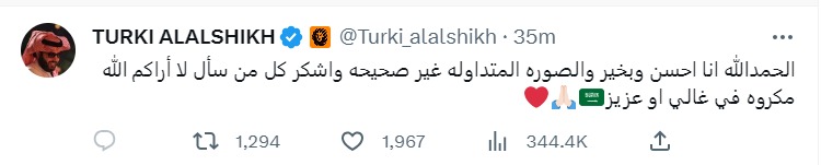 وكتب تركي الشيخ: الحمد لله أنا أحسن وبخير والصورة غير صحيحة، وأشكر كل من سأل".