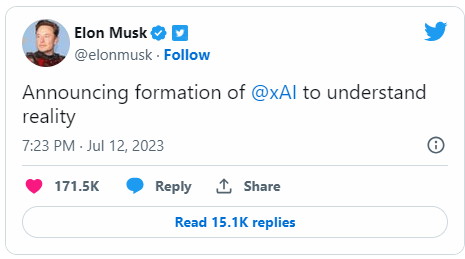 منذ أشهر طويلة وتحديدا منذ صعود شهرة أداة "تشات جي بي تي" من شركة "أوبن إيه آي" و الملياردير "إيلون ماسك" يلمح إلى أنه يريد إنشاء شركة تقوم على الذكاء الاصطناعي التوليدي يكون هدفها الأساسي فهم كيفية عمل الكون.