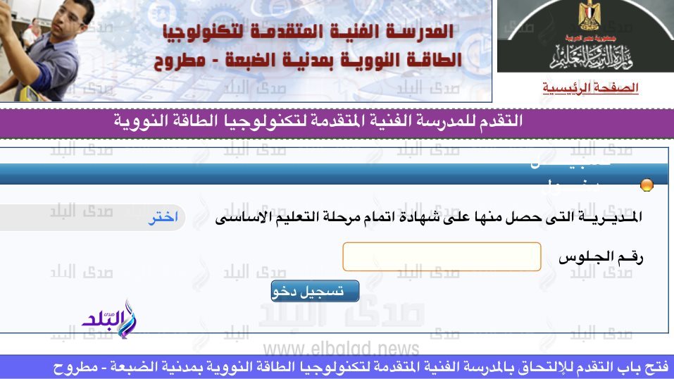 قالت وزارة التربية والتعليم والتعليم الفني ، أنه يمكن لمن يهمه الأمر الدخول على رابط التقديم في مدرسة الضبعة النووية على موقع وزارة التربية والتعليم والتعليم الفني على الانترنت ، من خلال الضغط على : http:// exis.emis.gov.eg