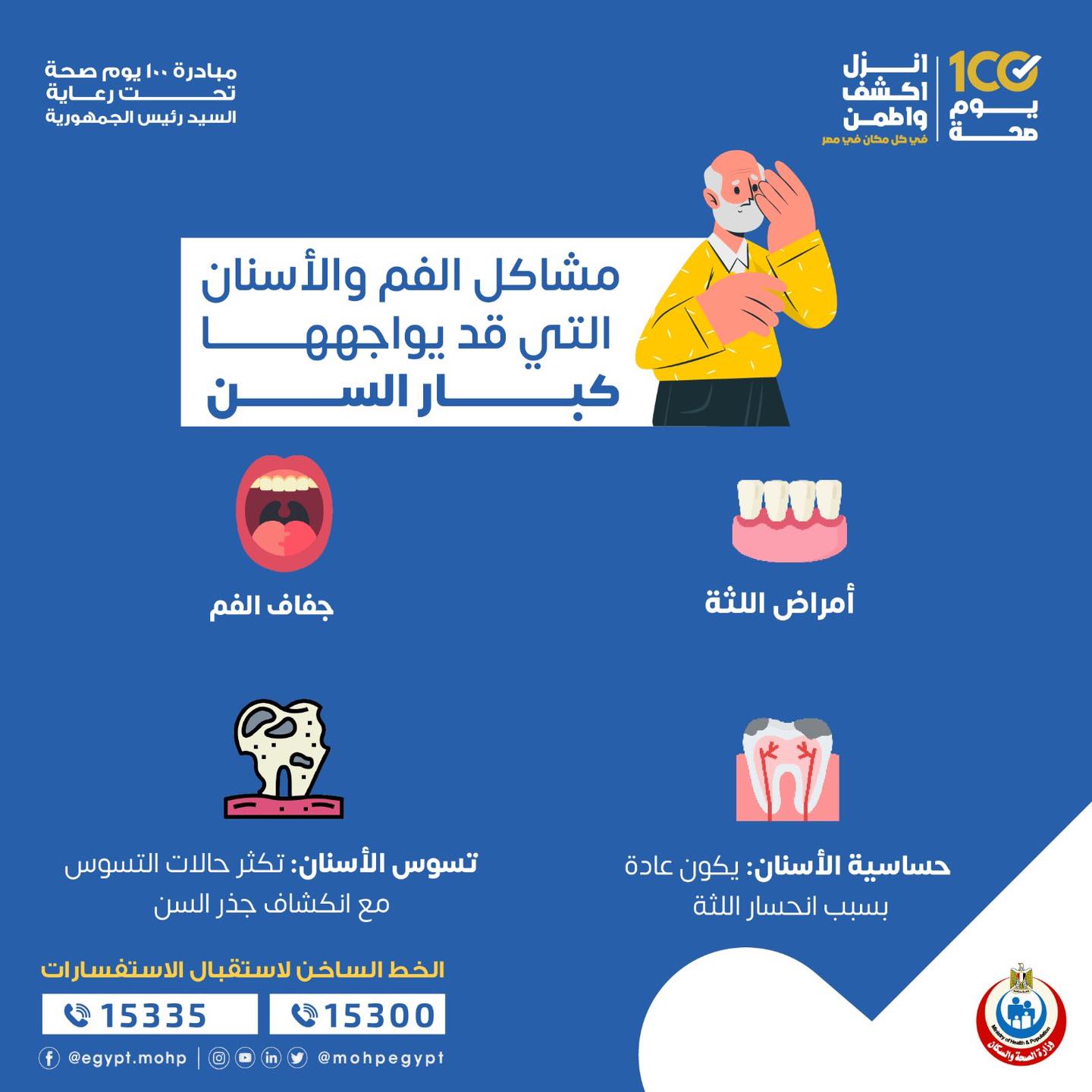 قالت وزارة الصحة والسكان ، إن هناك عدد من مشاكل الفم والأسنان التي قد يواجهها كبار السن ، والتي تتمثل في التالي : -