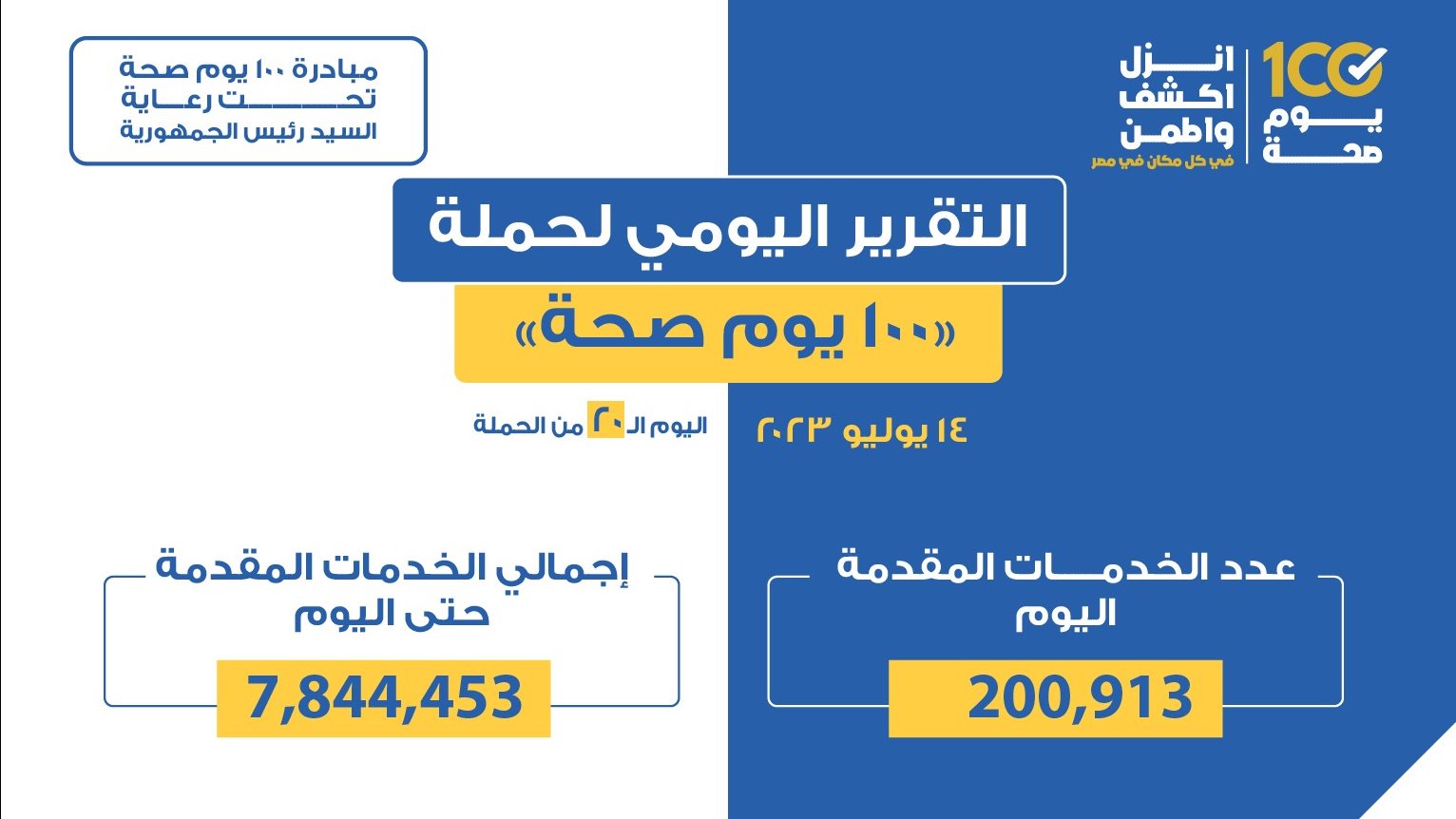 أعلن الدكتور خالد عبدالغفار وزير الصحة والسكان، تحقيق 200 ألف و913 خدمة من خلال حملة «100 يوم صحة» أمس الجمعة 14 يوليو، في جميع محافظات الجمهورية.