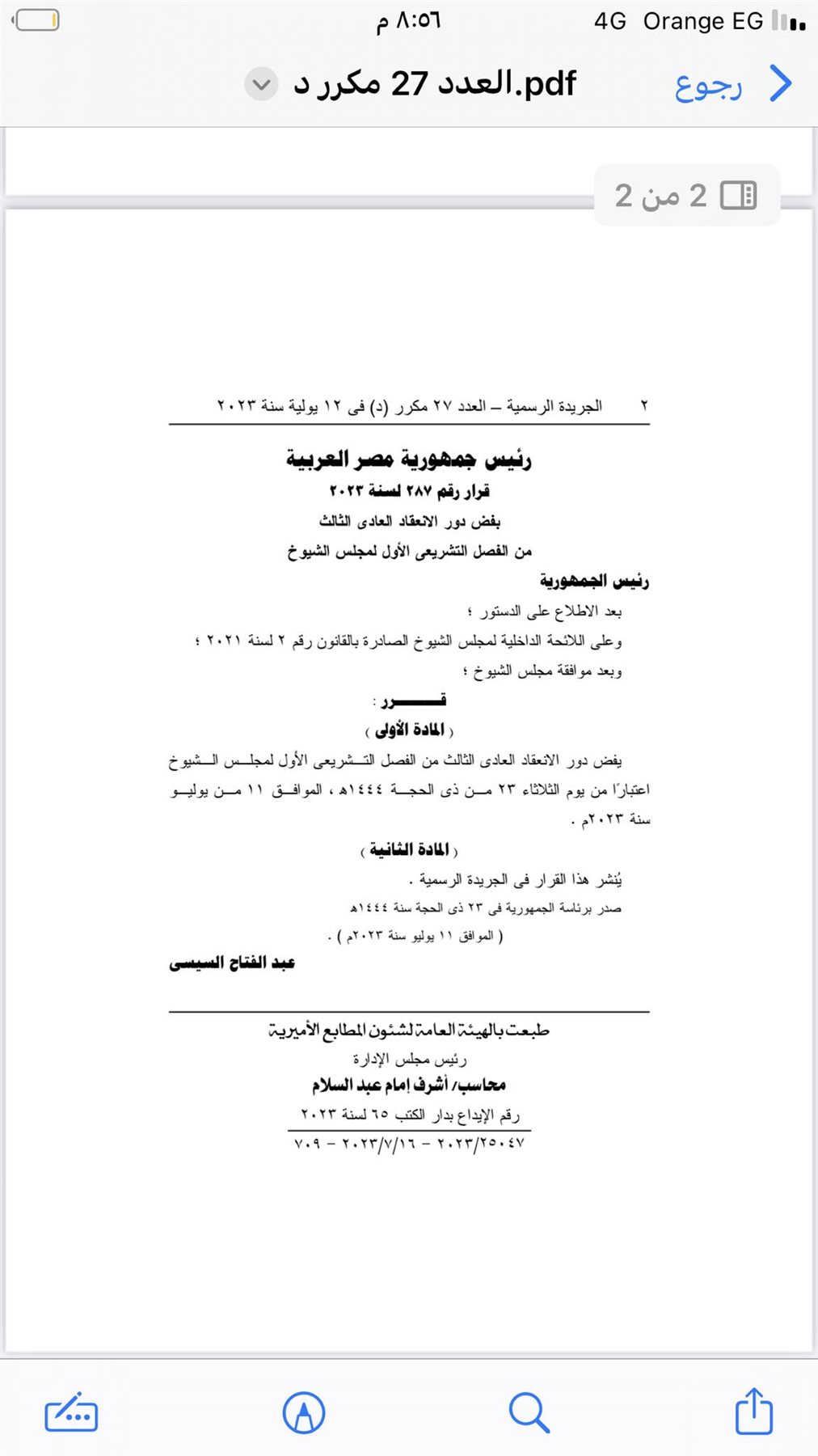 أصدر الرئيس عبدالفتاح السيسي، القرار 287 لعام 2023 بشأن فض دور الانعقاد العادي الثالث من الفصل التشريعي الأول لمجلس الشيوخ، حيث قرر فض دور الانعقاد الثالث من الفضل التشريعي الأول لمجلس الشيوخ أعتبارا من يوم الثلاثاء 32 من ذي الحجة 1444 ه، الموافق 11 من يوليو سنه 2023.