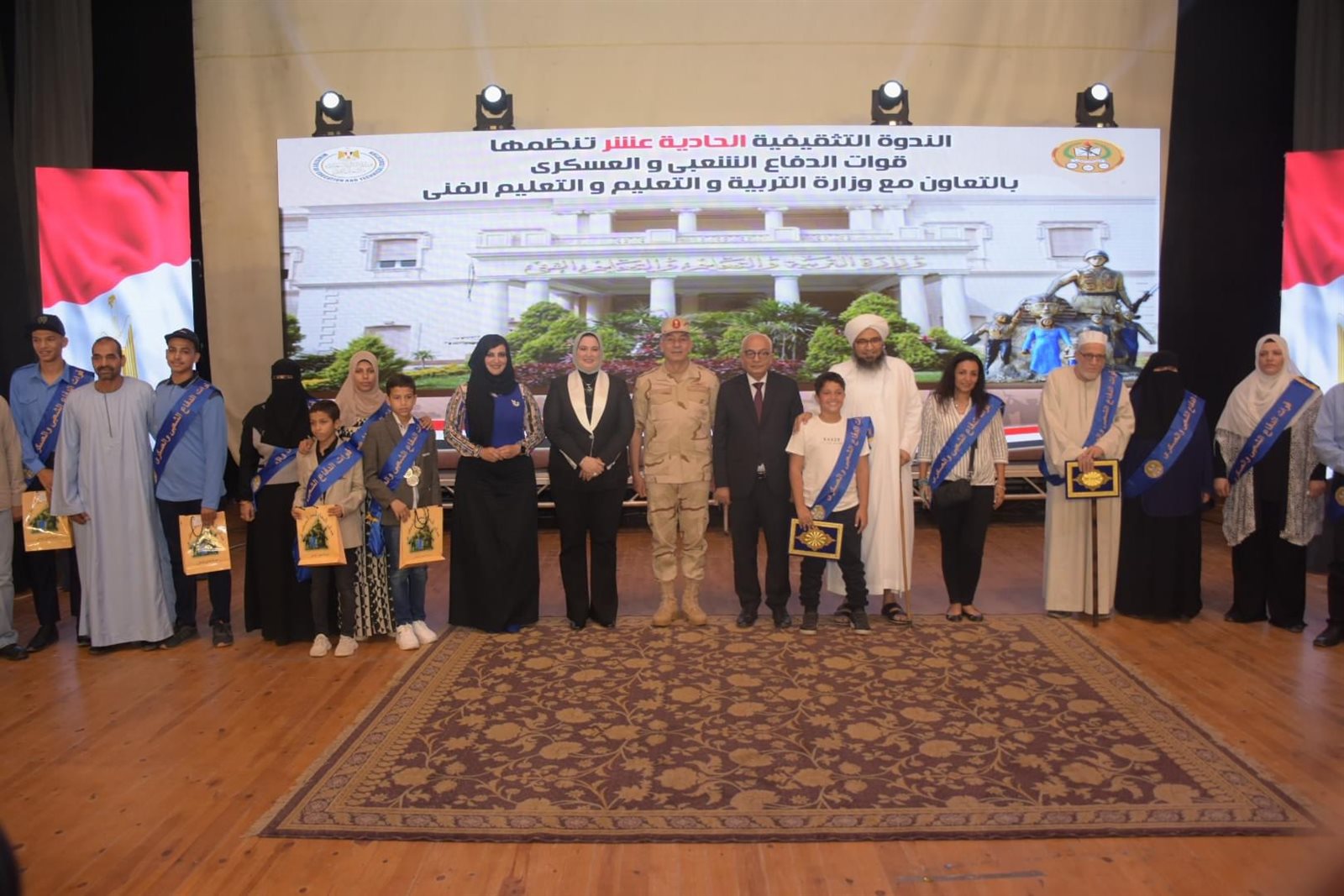وشملت الندوة تكريم عدد من أسر الشهداء ، والطلبة المتفوقين من مدارس التأسيس العسكري ، وعدد من ذوى الهمم ، وأختتمت الندوة بعزف السلام الوطني لجمهورية مصر العربية.