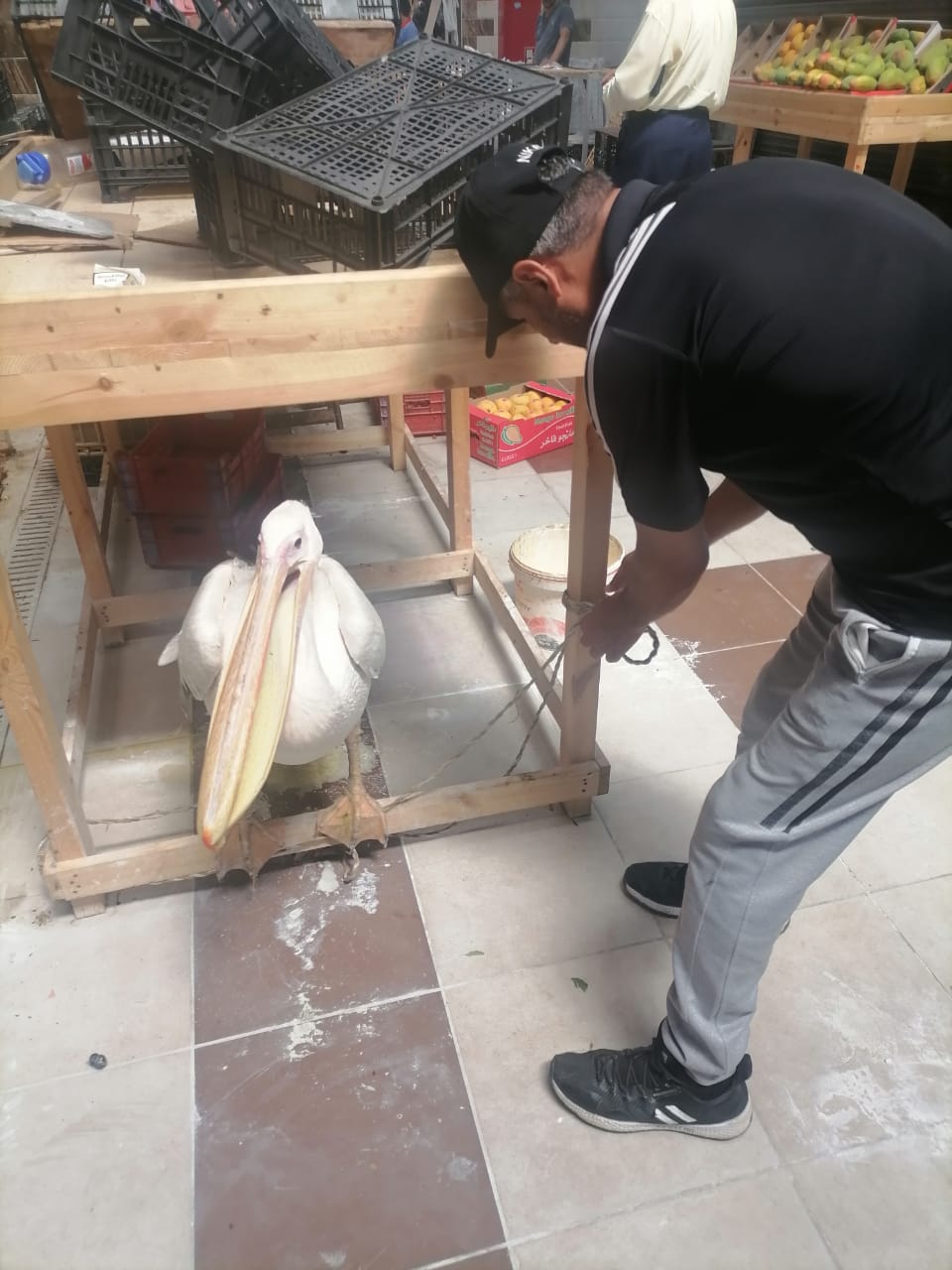 وقد قام فريق ادارة محمية اشتوم الجميل بضبط الطائر واتخاذ الاجراءات القانونية ضد المخالفين وإجراء كافة القياسات المطلوبة والكشف عليه ظاهرياً وعمل القياسات لتحديد نوعه وحالته الصحية ، وقد اثبت من المعاينة انه طائر البيليكان وفي حالة اعياء شديدة يستجوب معه وضعه تحت الرعاية البيطرية لإعادة تأهيله وتغذيته لاستعادة قدرته علي مواصلة الحياة في بيئته الطبيعية قبيل إعادة إطلاقه لبيئته الطبيعية بمحمية آشتوم الجميل.