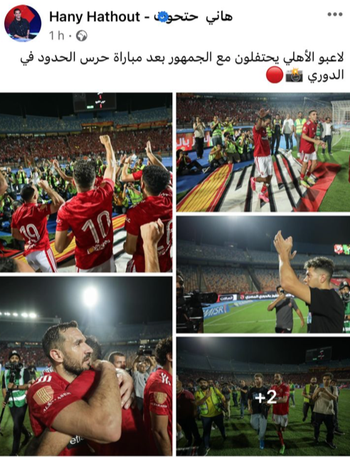 و كتب حتحوت عبر فيسبوك : لاعبو الأهلي يحتفلون مع الجمهور بعد مباراة حرس الحدود في الدوري .