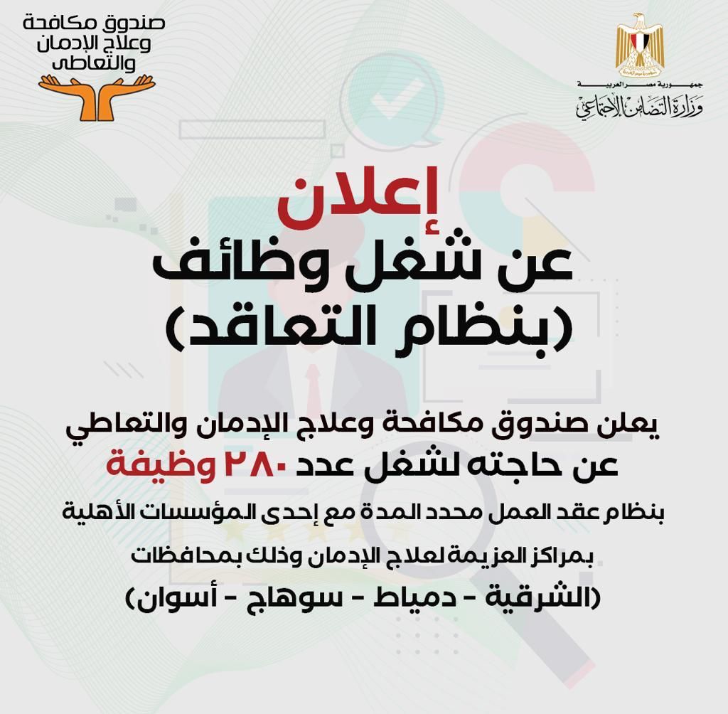 يستمر صندوق مكافحة وعلاج الإدمان والتعاطي التابع لوزيرة التضامن الاجتماعي فى تلقى طلبات عن حاجته لشغل عدد 280 وظيفة بنظام عقود العمل محددة المدة مع إحدى المؤسسات الأهلية بمراكز العزيمة لعلاج الإدمان الجديدة وذلك بالمحافظات الآتية: "الشرقية – دمياط – سوهاج – أسوان " حتى يوم 10 أغسطس المقبل .