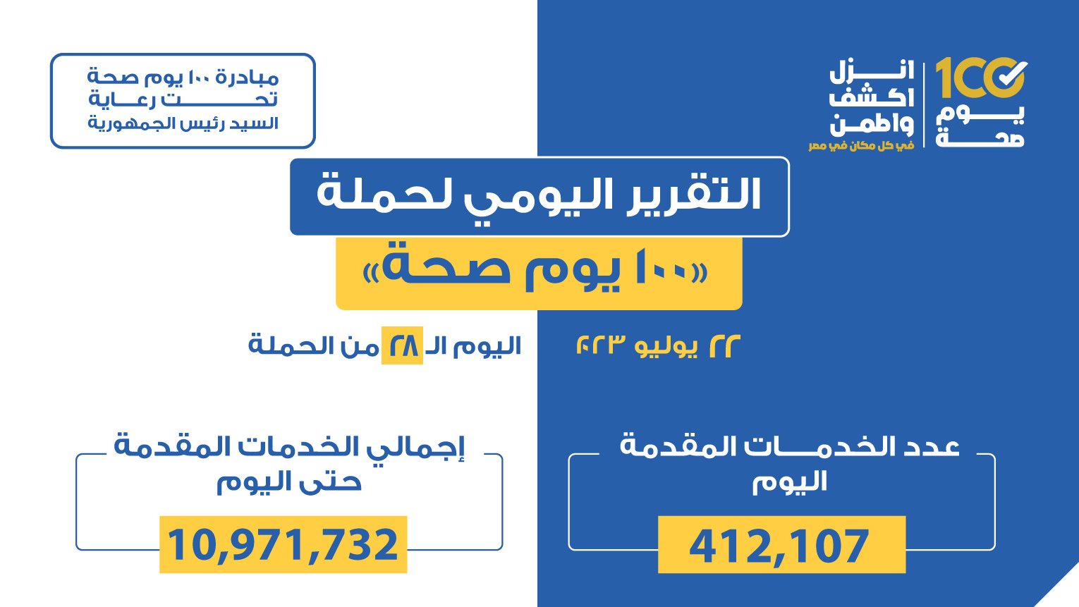 أعلن الدكتور خالد عبد الغفار، وزير الصحة والسكان، تقديم 412 ألفا و107 خدمات من خلال حملة «100 يوم صحة»، أمس السبت 22 يوليو، في جميع محافظات الجمهورية.