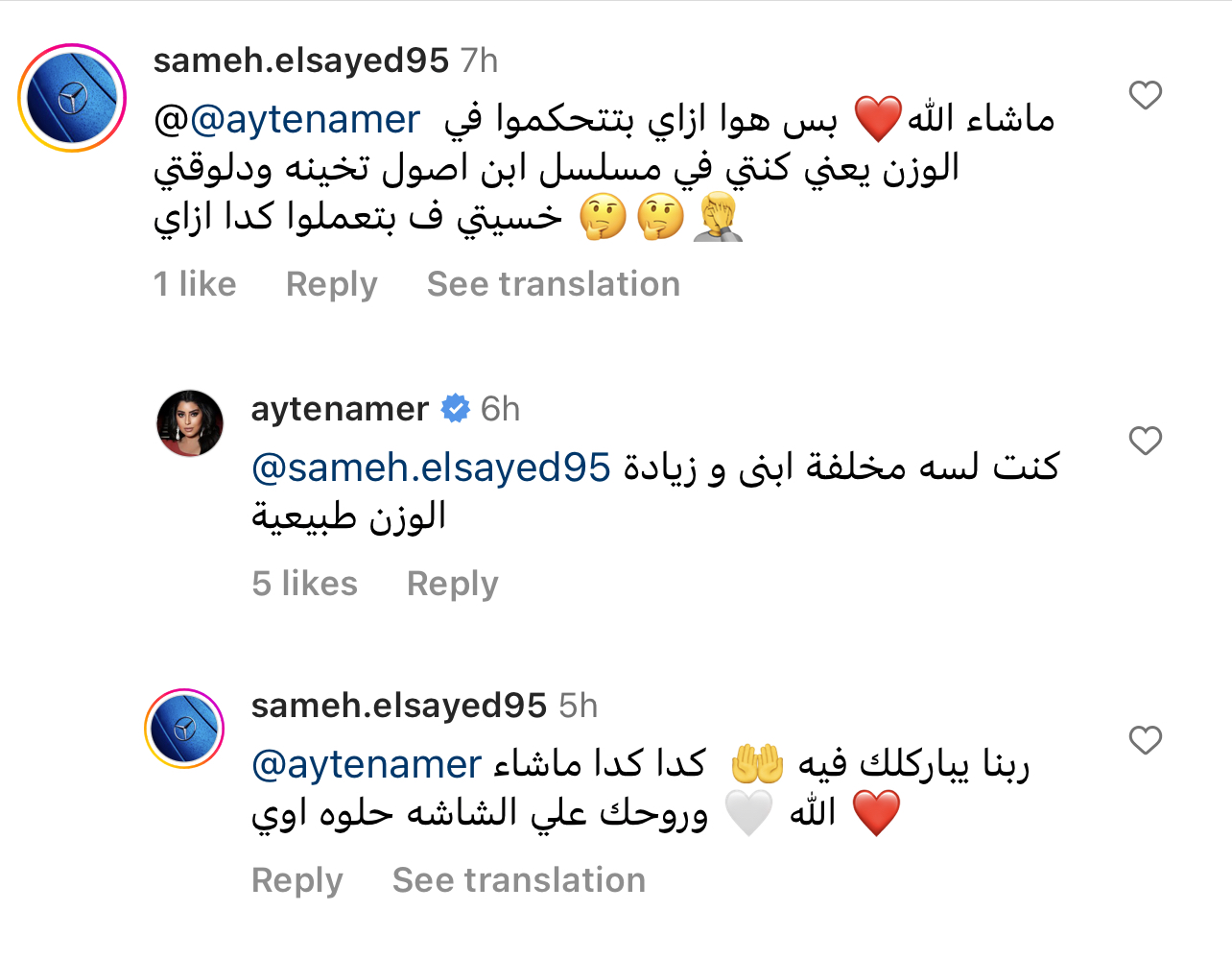 وتساءل أحد المتابعين عن رشاقة آيتن عامر في التعليقات، وكتب: “إزاي بتتحكموا في الوزن يعني كنتي في مسلسل ابن الأصول تخينة دلوقتي خسيتي؟”.