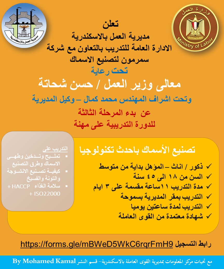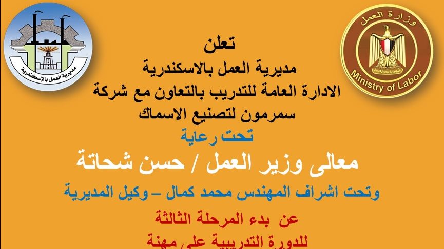 أعلنت مديرية العمل بمحافظة الإسكندرية عن بدء المرحلة الثالثة من برتوكول التعاون المشترك على التدريب المهنى للشباب فى مجال تصنيع الأسماك بأحدث وسائل التكنولوجيا ، بالتعاون مع مجموعة شركات سمرمون لتصنيع الأسماك ، جاء ذلك تنفيذاً لتوجيهات وزير العمل حسن شحاتة بالاهتمام بتدريب الشباب وتطوير إمكانياتهم وتوفير فرص عمل لائقة وحقيقية لهم ، أو المساهمة في إقامة المشروعات الصغيرة للحد من مشكلة البطالة ودعم الاقتصاد بمهن حديثة تواكب التطور التكنولوجي ومتطلبات سوق العمل.
