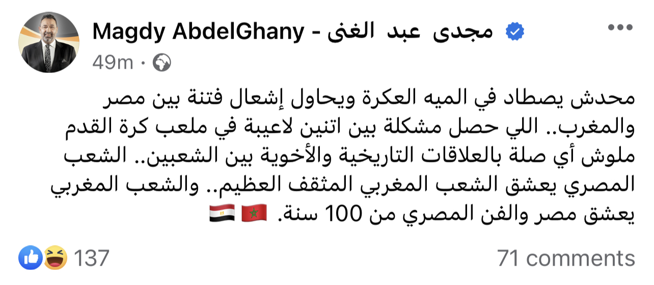 وكتب مجدي عبد الغني عبر فيسبوك: “محدش يصطاد في الميه العكرة ويحاول إشعال فتنة بين مصر والمغرب.. اللي حصل مشكلة بين اتنين لاعيبة في ملعب كرة القدم ملوش أي صلة بالعلاقات التاريخية والأخوية بين الشعبين.. الشعب المصري يعشق الشعب المغربي المثقف العظيم.. والشعب المغربي يعشق مصر والفن المصري من 100 سنة”.