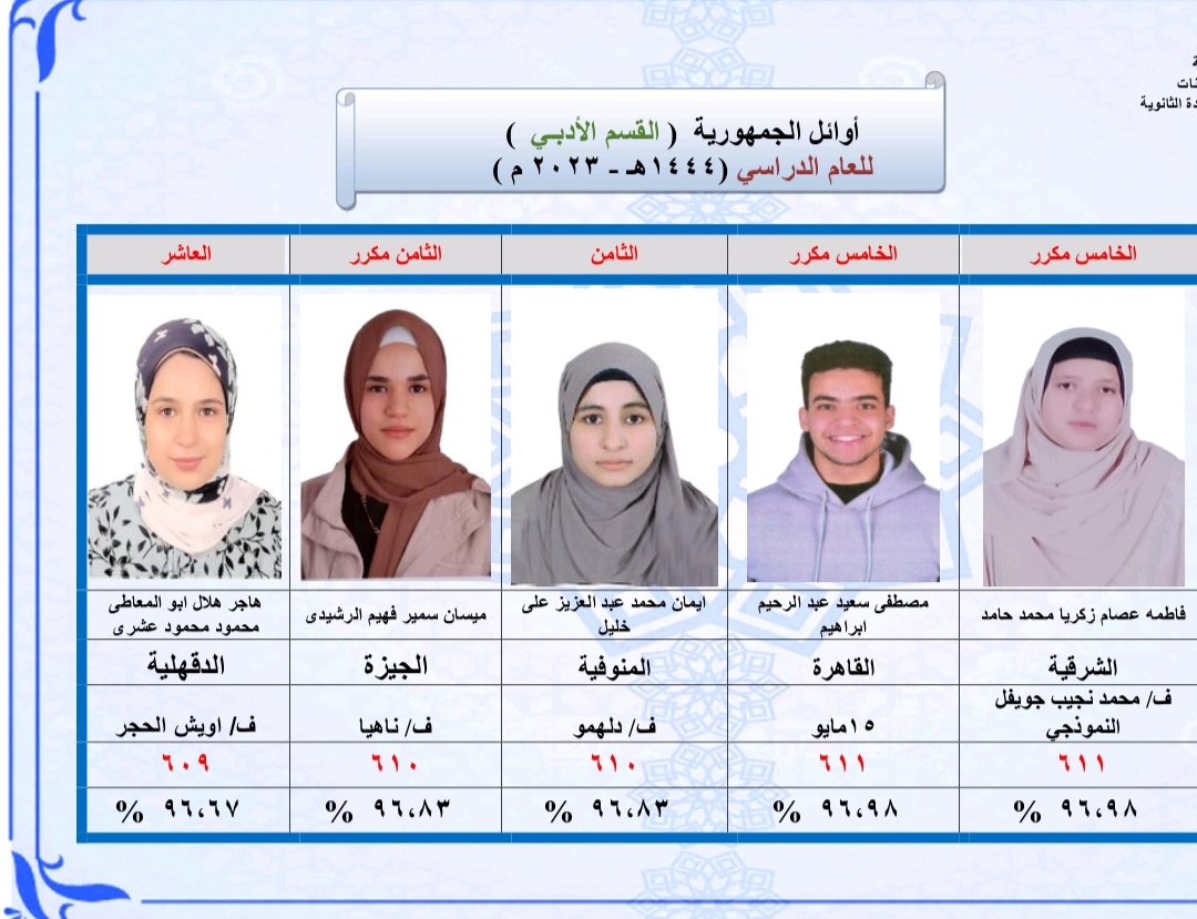 الأول: أسماء عبد الله عبد الله محمد السماحي، معهد فتيات أبو زيادة بكفر الشيخ، مجموع (649)، بنسبة 99.85%.
