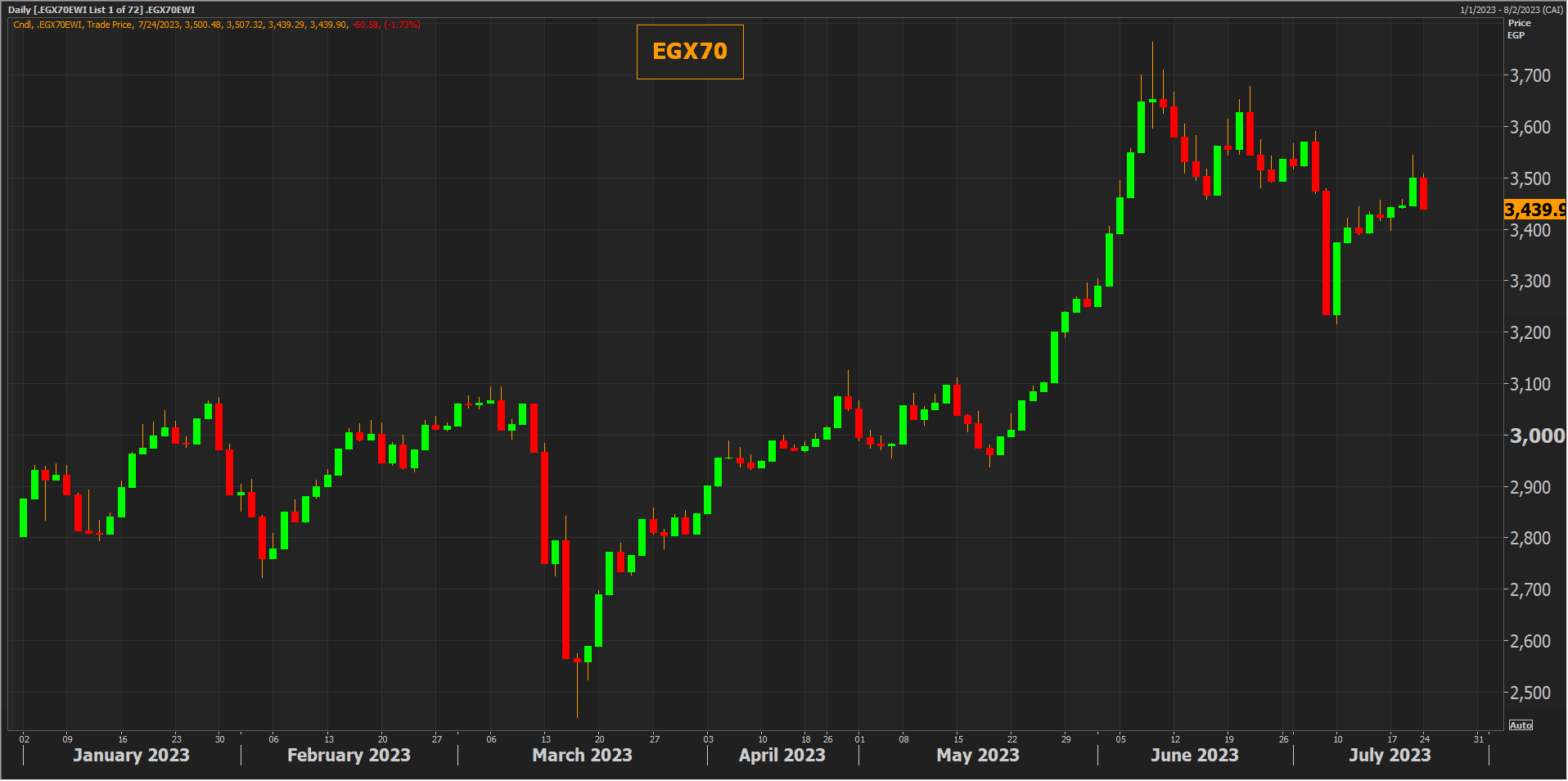 وانخفض المؤشر الثلاثيني بنحو 0.3% متراجعاً للجلسة الخامسة على التوالي بضغط من تراجع القيادي سهم الشرقية للدخان بنحو 2.2% لأدنى مستوياته في شهرين بالإضافة إلى انخفاض سهم أبو قير للأسمدة بأكثر من 1%.