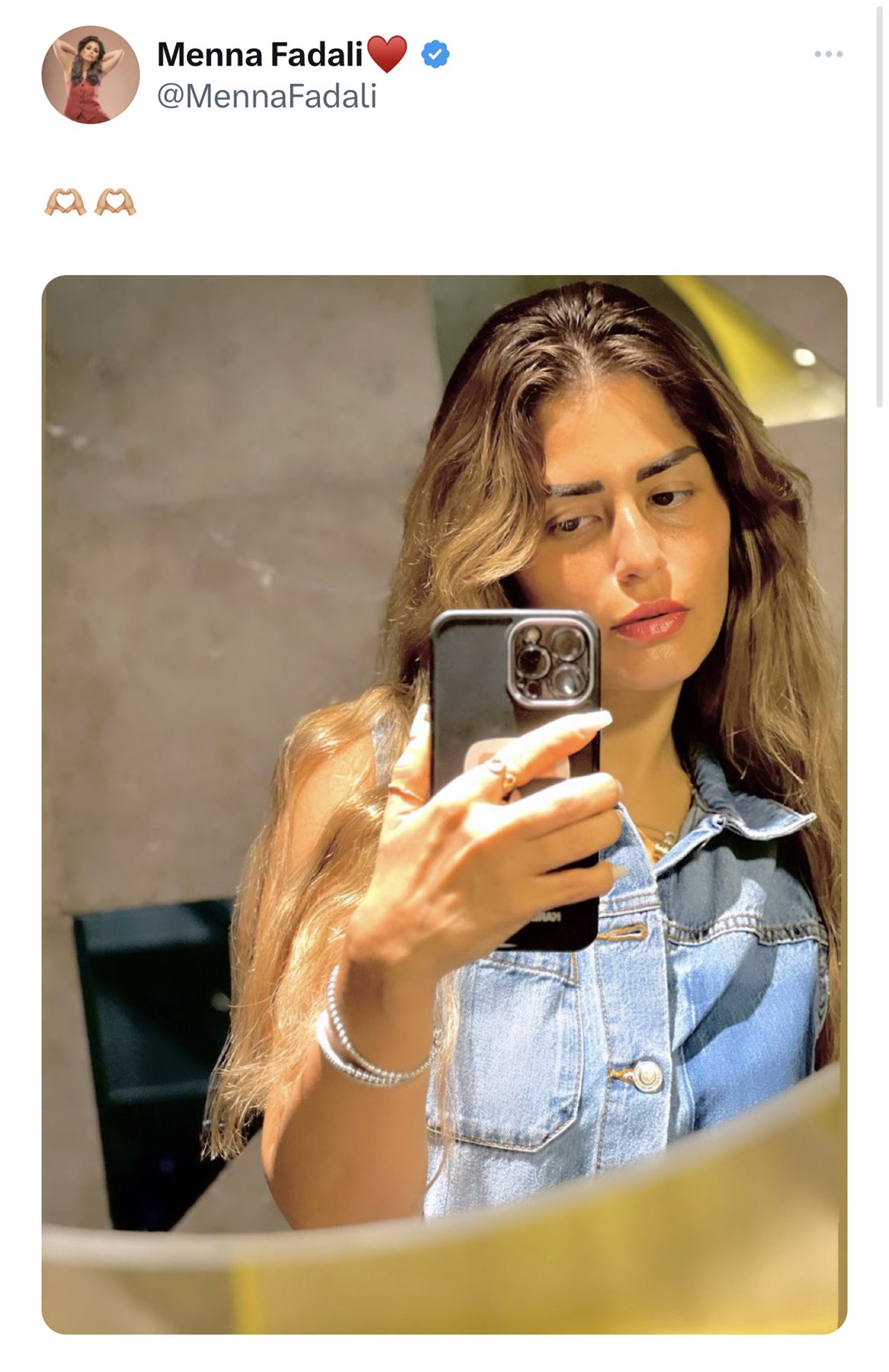 وظهرت منة فضالي واقفة أمام المرآة، مرتدية بلوزة جينز، تاركة خصلات شعرها منسدلة علي أكتافها.