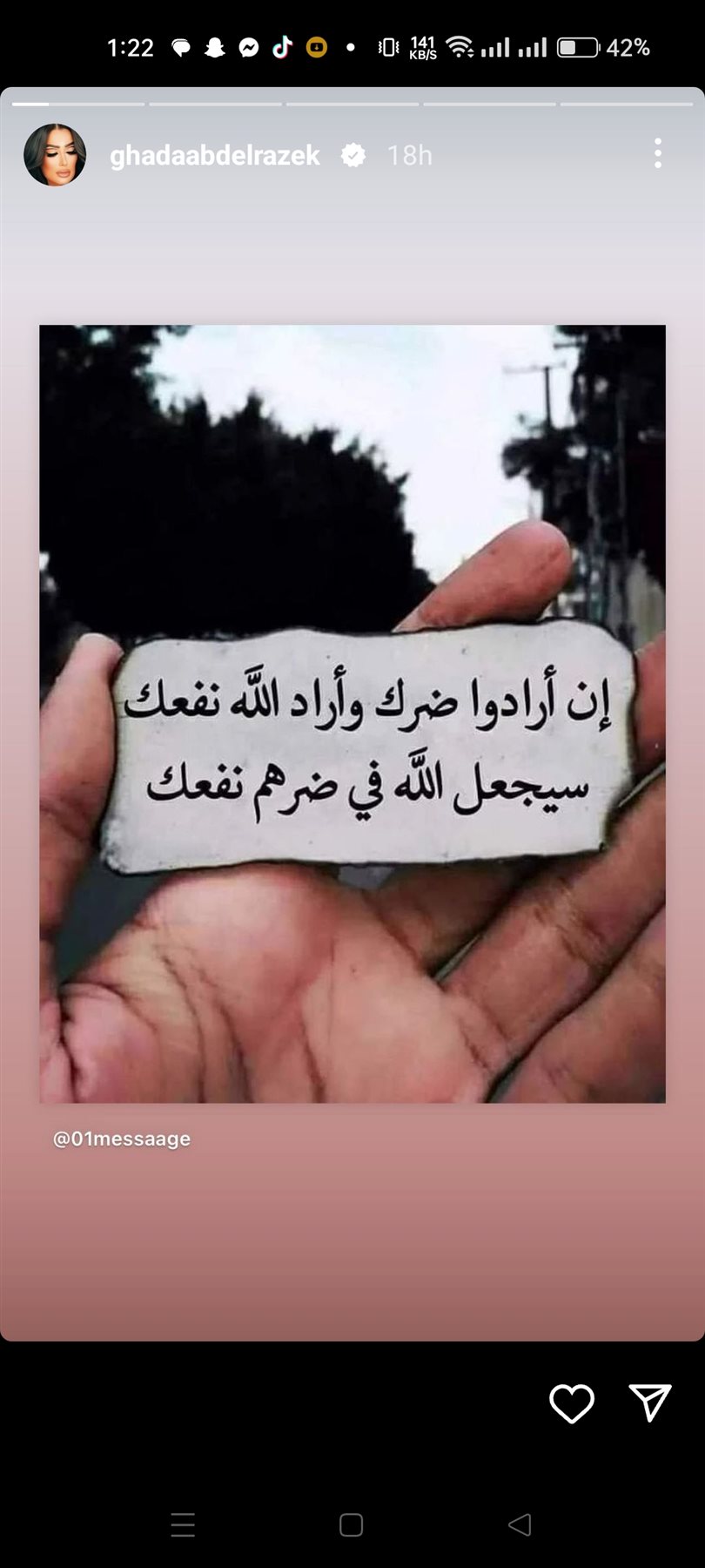 وكتبت غادة في الصور:"إن أرادوا ضرك وأراد الله نفعك سيجعل الله في ضرهم نفعك".