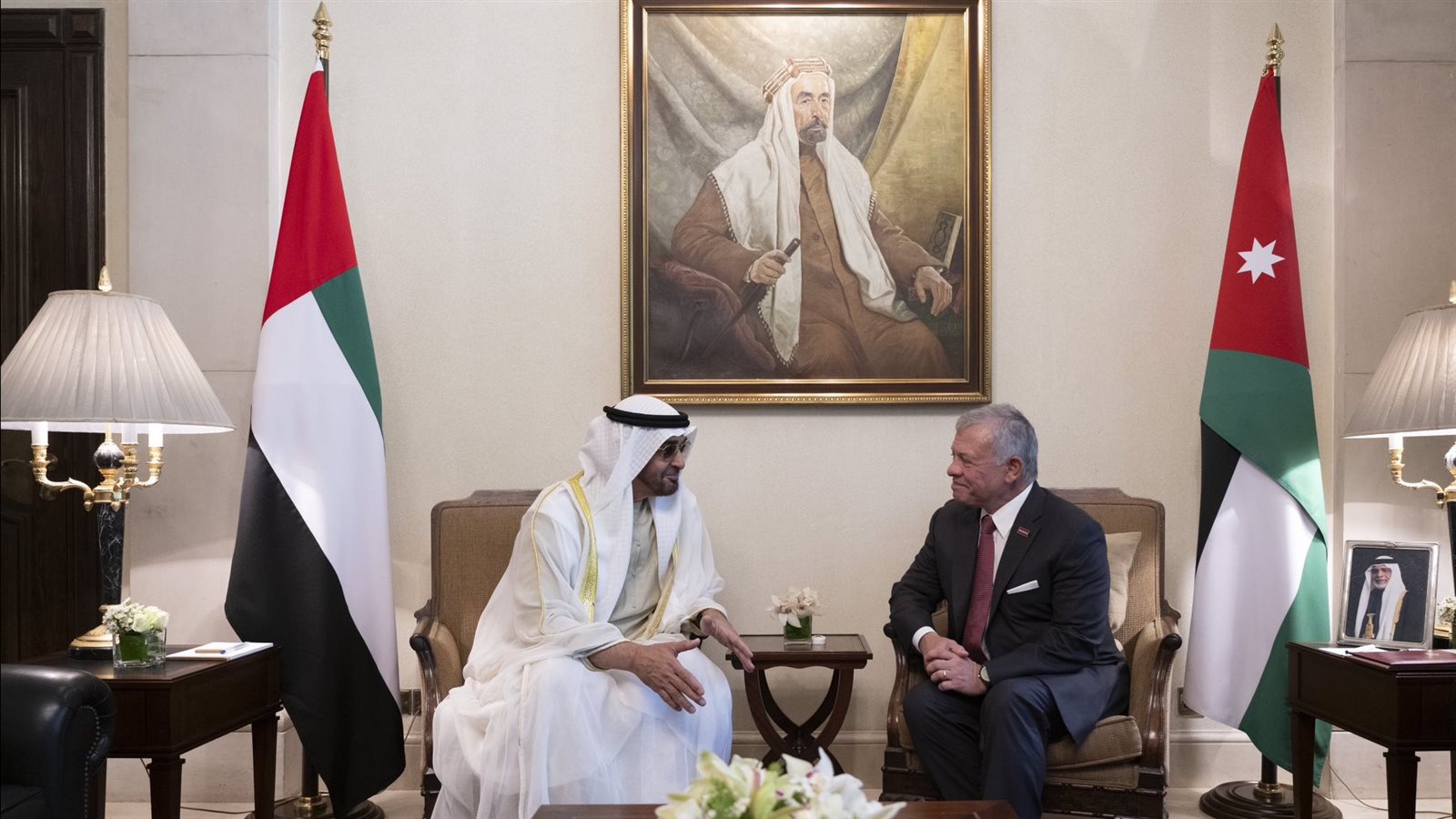 وفور وصوله، عقد العاهل الأردني مع رئيس دولة الإمارات جلسة مباحثات، حيث رحب الملك عبدالله الثاني بضيفه الكريم في الأردن.
