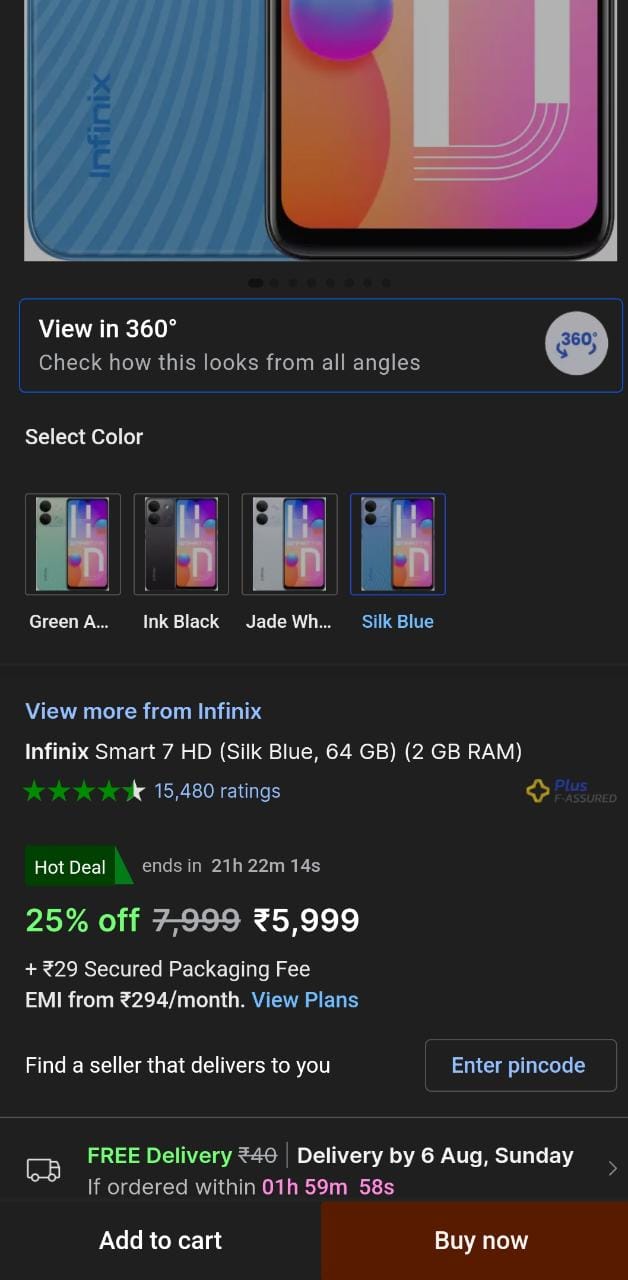 فشاهدنا عرضا رائعا على موقع Flipkart الهندي يبيع هاتف إنفينيكس infinix smart 7 HD ليصل سعره بعد الخصم إلى 5999 روبية هندية (أي ما يعادل 2200 جنيه مصري تقريبا ).