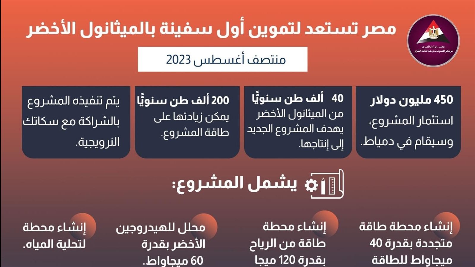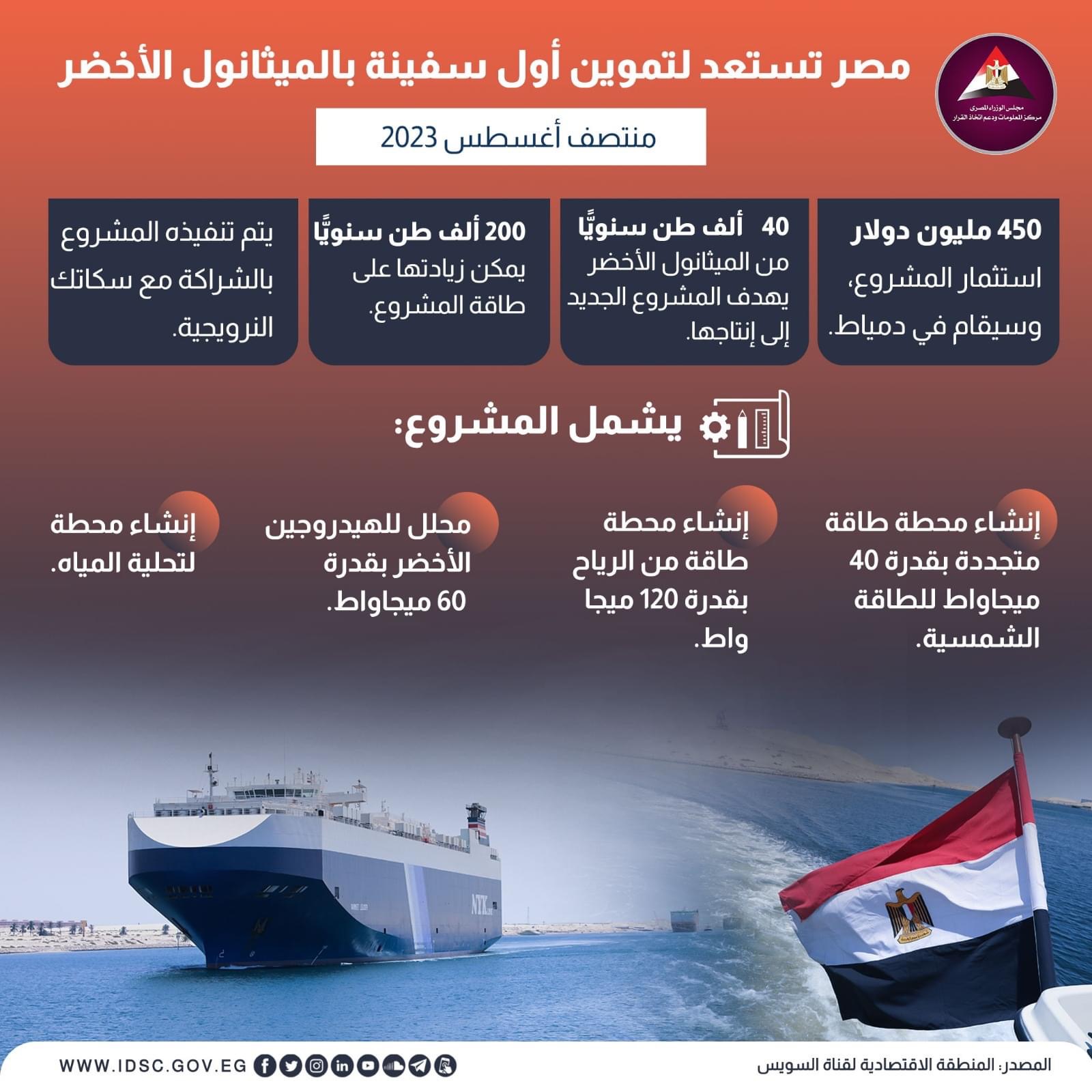 نشر مركز المعلومات ودعم اتخاذ القرار بمجلس الوزراء انفوجراف عبر صفحته الرسمية على موقع التواصل الاجتماعي فيس بوك بشان استعداد مصر لتموين أول سفينة بالميثانول الأخضر.