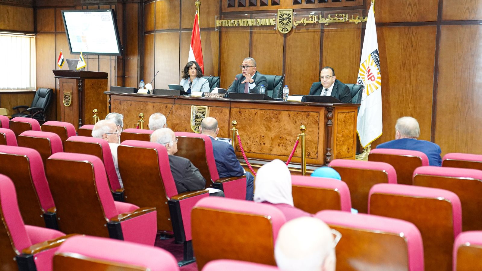 وفي كلمته استعرض أ.د علاء زهران الأستاذ بمركز السياسات الاقتصادية الكلية ورئيس المعهد السابق، طبيعة عمل المعهد ورؤيته ورسالته باعتباره مركز فكر رائد مؤثر وطنيًا وإقليميًا ومتميز دوليًا، وأهدافه العشرة كما وردت بالقانون رقم 13 لسنة 2015م، بالإضافة إلى توضيح الهيكل التنظيمي للمراكز العلمية بالمعهد.