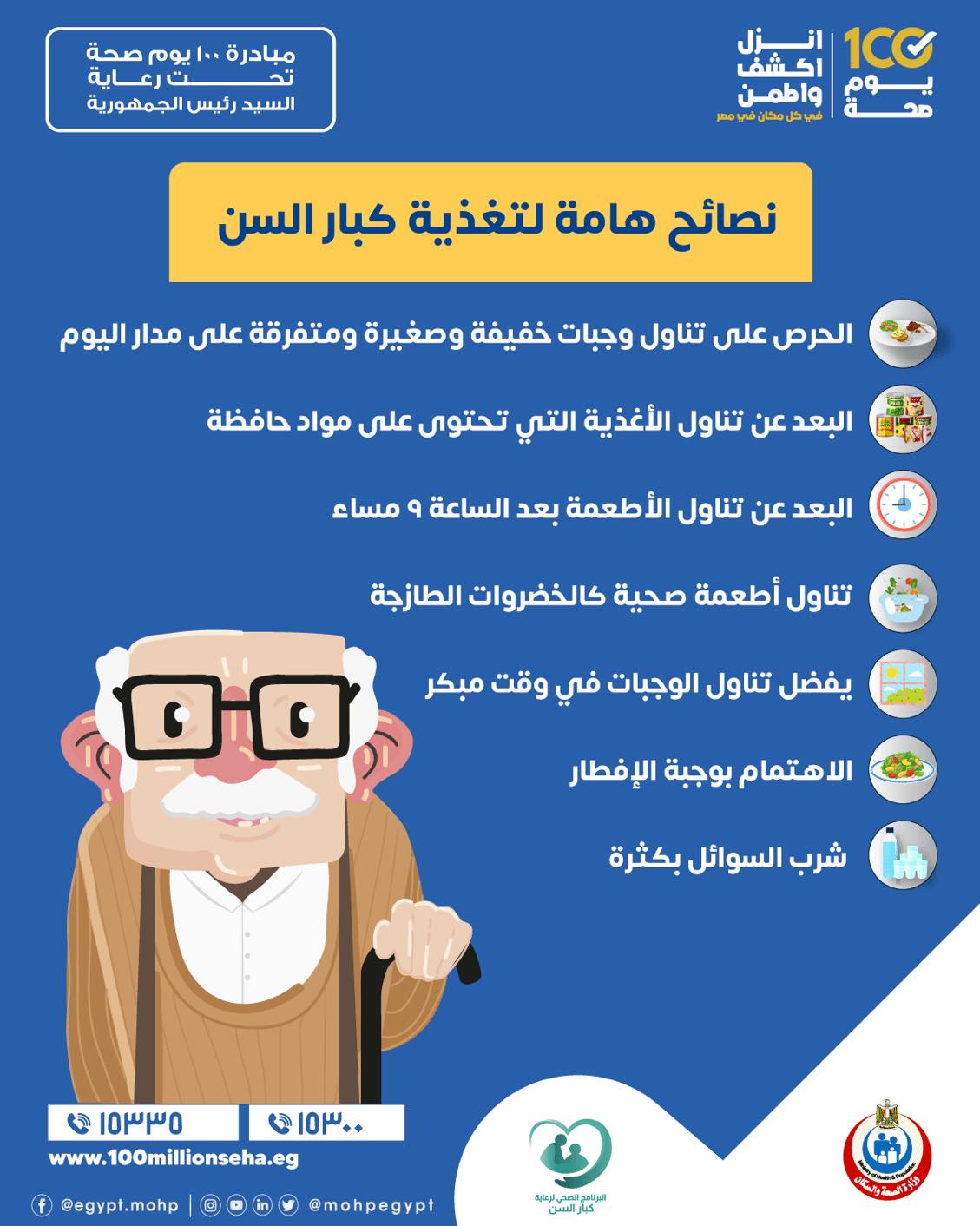 نشرت وزارة الصحة والسكان ، مجموعة من المعلومات ونصائح غذائية مهمة لكبار السن من أجل تحسين الصحة العامة لهم.