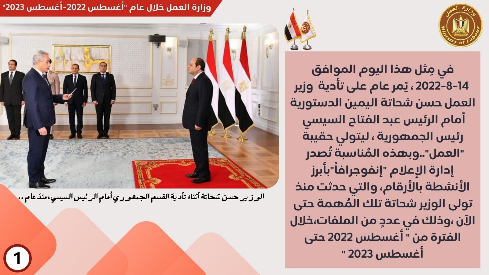 أصدرت وزارة العمل اليوم الإثنين، "إنفوجرافاً" يَرصُد بالأرقام أبرز الأنشطة، خلال عام ، وذلك بمُناسبة مرور سنة على تولي وزير العمل حسن شحاتة حقيبة "العمل"، وتأديته- في مثل هذا اليوم- اليمين الدستورية أمام الرئيس عبدالفتاح السيسي ؛ حيث حرص وزير العمل منذ تولي حقيبة العمل على إطلاق توجيهات مباشرة إلى جميع العاملين بالديوان العام، والإدارات المركزية، ومديري المديريات،بتفعيل وترسيخ ثقافة الثقة بين المواطن والوزارة ، من خلال التعامل بمصداقية في تقديم الخدمات للمواطنين .