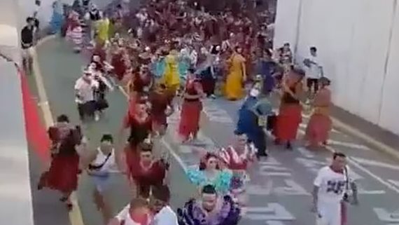 وفي مقطع الفيديو المنتشر، يظهر المصارع وهو يرتدي زيه التقليدي ساخرا من ثور أبيض بردائه الوردي والأصفر ثم اقترب أكثر فأكثر من قرني الثور قبل أن يقذفه الحيوان فجأة في الهواء.