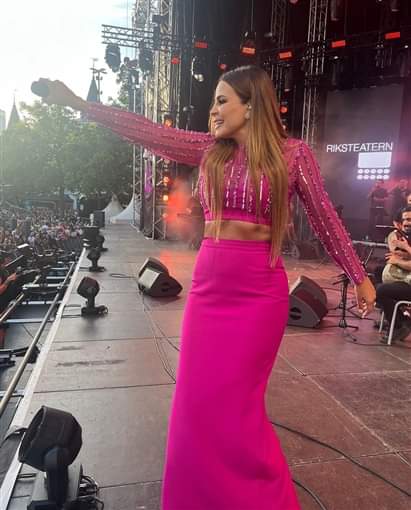 وظهرت كارول سماحة في حفلها بفستان بمالمو مصمم خصيصا لها باللون الفوشيا من تصميم نور فتح الله .