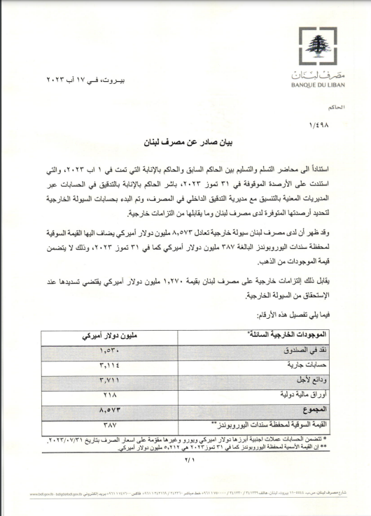 وأضاف منصوري في بيانه، أن لبنان لديها سيولة خارجية تعادل 8.573 مليون دولار أمريكي، ويضاف إلى السيولة القيمة السوقية لمحفظة سندات اليورو بوندز البالغة 387 مليون دولار من دون قيمة موجودات.