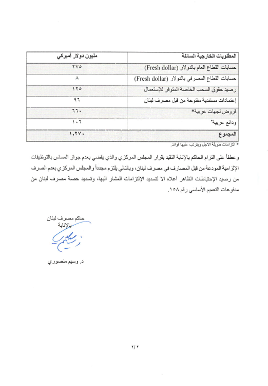 أعلن حاكم مصرف لبنان بالإنابة وسيم منصوري، أن هناك التزامات خارجية على البنك المركزي اللبناني بقيمة 1.27 مليون دولار يجب سدادها عند الاستحقاق من السيولة.