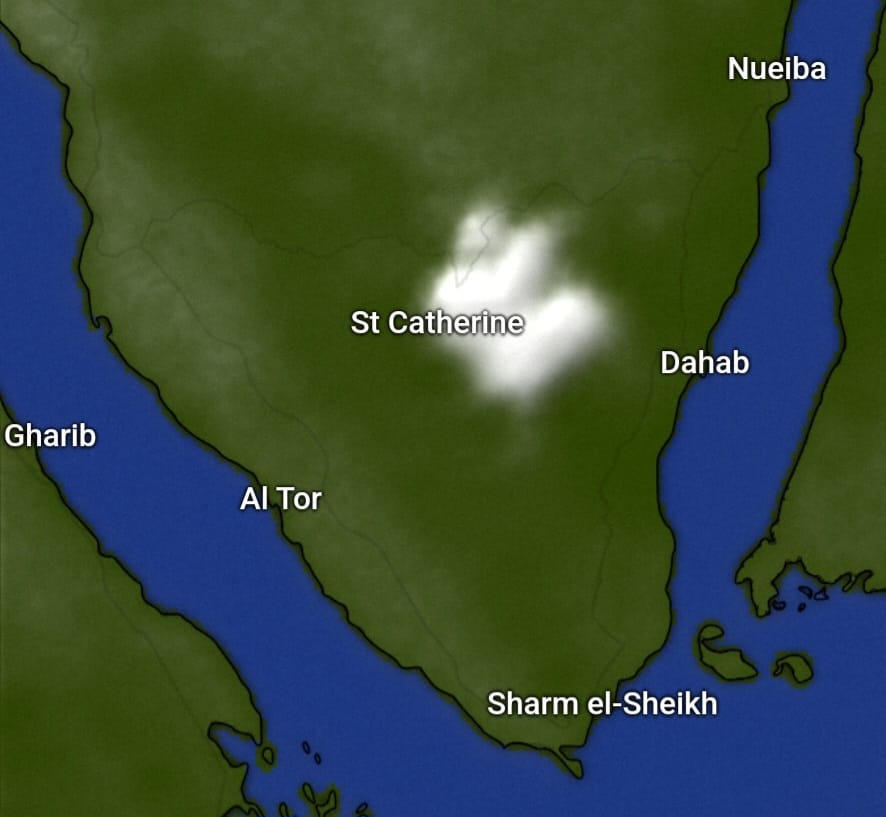 وبحسب نشرة الأرصاد الجوية يتوقع الخبراء، هطول أمطار خفيفة قد تكون متوسطة ورعدية أحيانا على مناطق من جنوب سيناء وقد تصل لحد السيول على مرتفعات سانت كاترين، كما تمتد الأمطار خفيفة ورعدية أحيانا على جنوب سلاسل جبال البحر الأحمر.