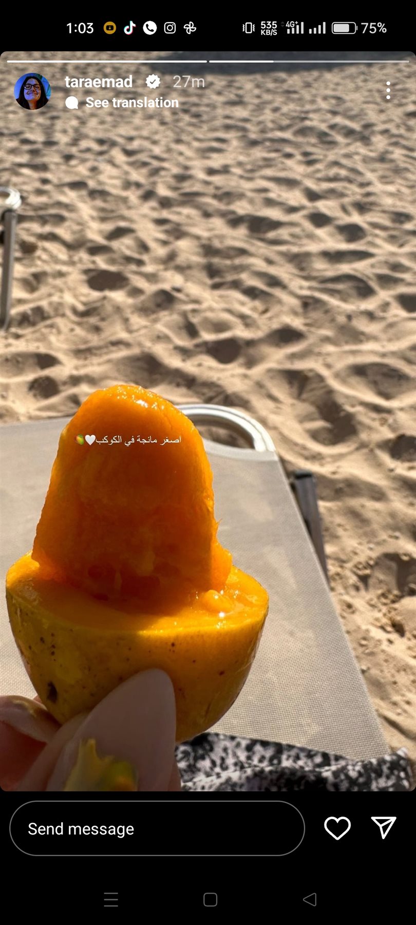 وشاركت تارا عماد، صورة على البحر أثناء تناولها المانجا، وعلقت: “أصغر مانجة في الكوكب”.