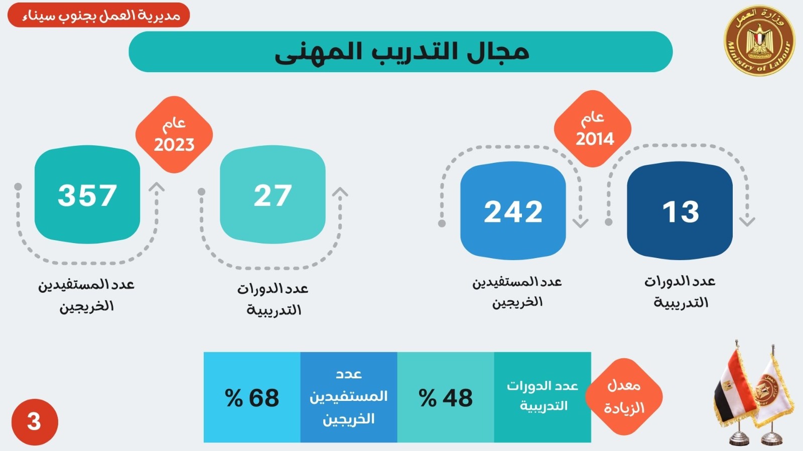 وجاء في الإنفوجراف أنه في مجال التدريب المهني بلغ عدد الدورات التدريبية المجانية المقدمة للشباب حتى عام 2014,13 برنامج تدريبي استفاد منها 242 متدربا ومتدربة، وفي عام 2023 بلغ عدد الدورات التدريبية 27 دورة، استفاد منها 357 متدربا، بزيادة قدرت بنسبة 68 %، كما أنه في مجال شؤون المرأة وتكافؤ الفرص في عام 2014 لم تكن هناك أي برامج خاصة بهذا المجال، وفي عام 2023 بلغت عدد البرامج التدريبية المقدمة لأهالي سيناء 6 برامج استفاد منها 150 سيدة، وذلك في إطار التمكين الاقتصادي وفتح آفاق جديدة لتنمية المرأة السيناوية بالتعاون مع الوزارات والجهات المعنية، لإحياء دور المرأة في العمل والصناعة.