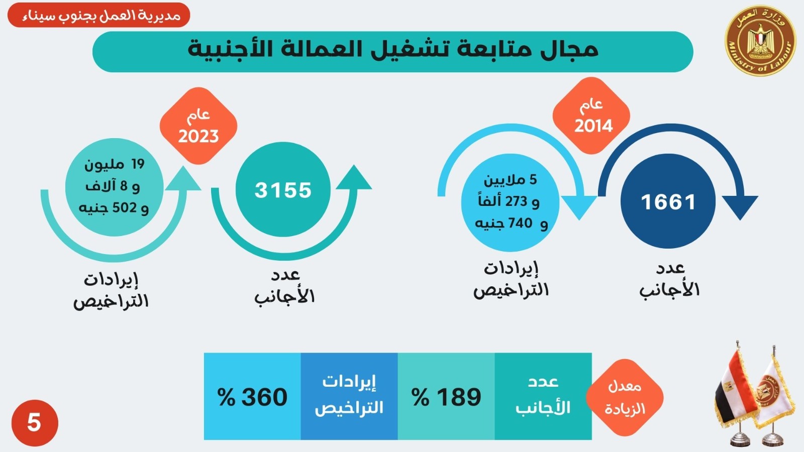 وفيما يتعلق بإيرادات تصاريح العمالة الأجنبية رصد الإنفوجراف أن عدد الأجانب المشتغلين 1661 أجنبيا في عام 2014، بإيرادات تصاريح عمل بلغت 5 ملايين و 273 ألفا و 740 جنيها، أما في عام 2023 بلغ عدد الأجانب المشتغلين 3155 أجنبيا، بإيرادات تصاريح عمل 19 مليونا و 8 آلاف و 502 جنيه، بمعدل زيادة 189 % في عدد الأجانب، و 360 % في إجمالي الإيرادات بما يعظم الدخل القومي ويساهم في زيادة العملة الصعبة داخل السوق المصري.