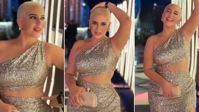 وظهرتأسما شريف منير ، فى أول ظهور لها بعد حلاقة شعرها بإطلالة أنيقة ومميزة، وهو ما لفت الأنظار إليها، حيث تألقت بتوبباللون الفضى اللامع مكشوف الأكتاف والصدر، وجيب ذات فتحة من الساق.