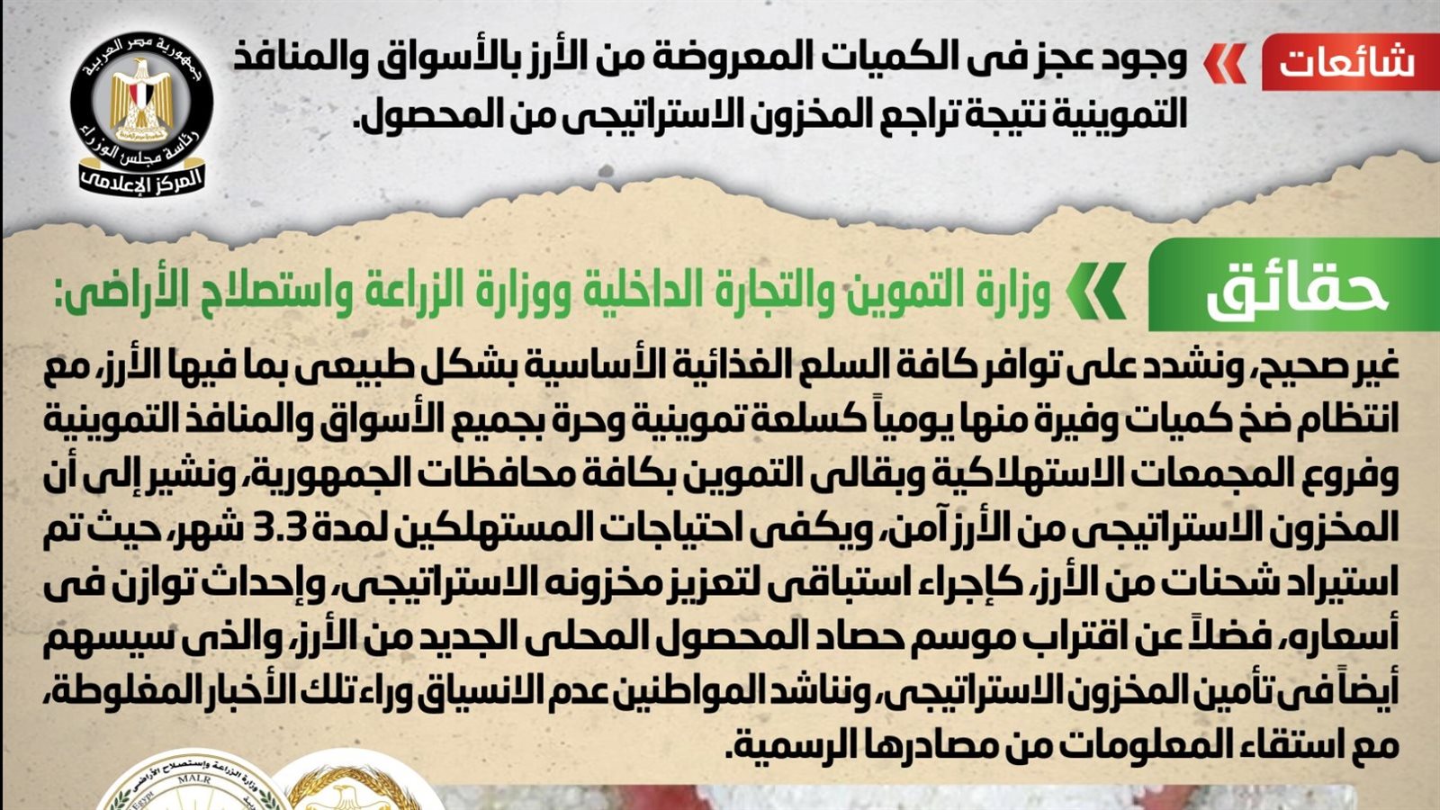 وكشف المركز الإعلامى لمجلس الوزراء، أنه فى ضوء ما تردد من أنباء بشأن وجود عجز في الكميات المعروضة من الأرز بالأسواق والمنافذ التموينية نتيجة تراجع المخزون الاستراتيجي من المحصول، تواصل المركز مع وزارتي التموين والتجارة الداخلية والزراعة واستصلاح الأراضي، وقد تم نفي تلك الأنباء.