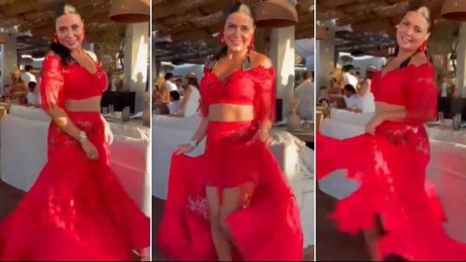 وظهرت رانيا يوسف بإطلالة جريئة مرتدية فستانا اسبانى باللون الاحمر الفاقع مكشوف البطن ومن الناحية الجماليةاعتمدت على وضع المكياج بلمسات البسيطة وترك شعرها منسدلا على كتافيها .