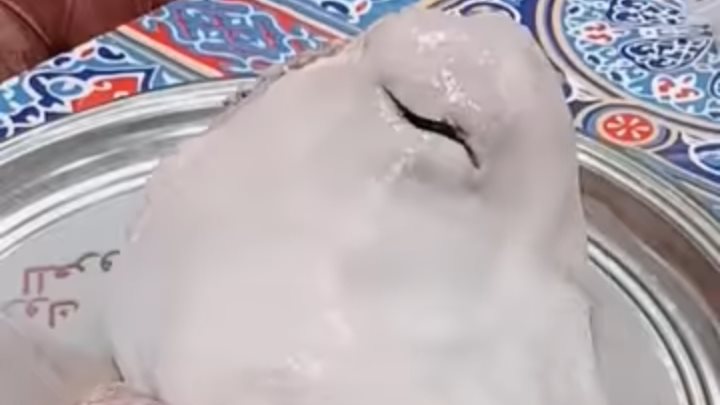 قام نابلسي بتقسيم اللحم إلى جزئين منفصلين على الطاولة، جزء به قطع الكبد الني والآخر به قطع اللحم الأبيض، وعلى عكس المتوقع، أحضر الشيف رغيف خبز ثم شرع في تناول اللحم الني خلال الفيديو.